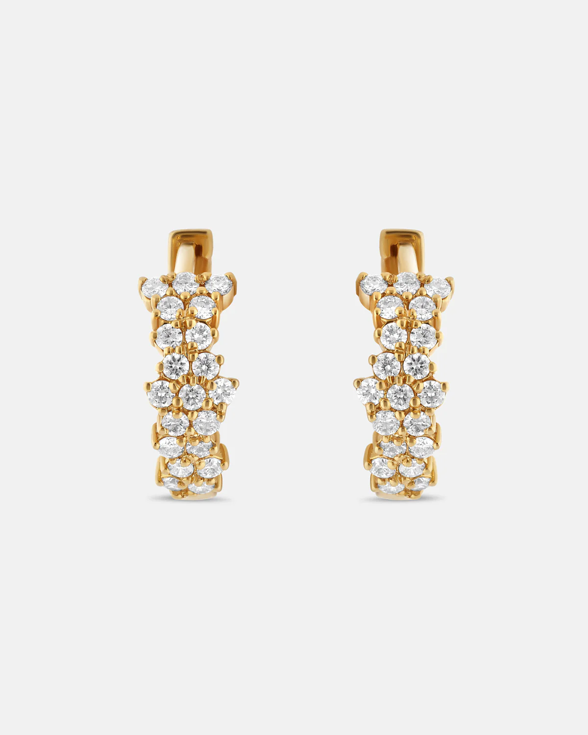 A refined play of light and structure, these hoop earrings unite the sleek purity of gold with a constellation of meticulously set diamonds. The clustered arrangement forms a sculptural surface dimensional, textural, and quietly radiant from every angle.
