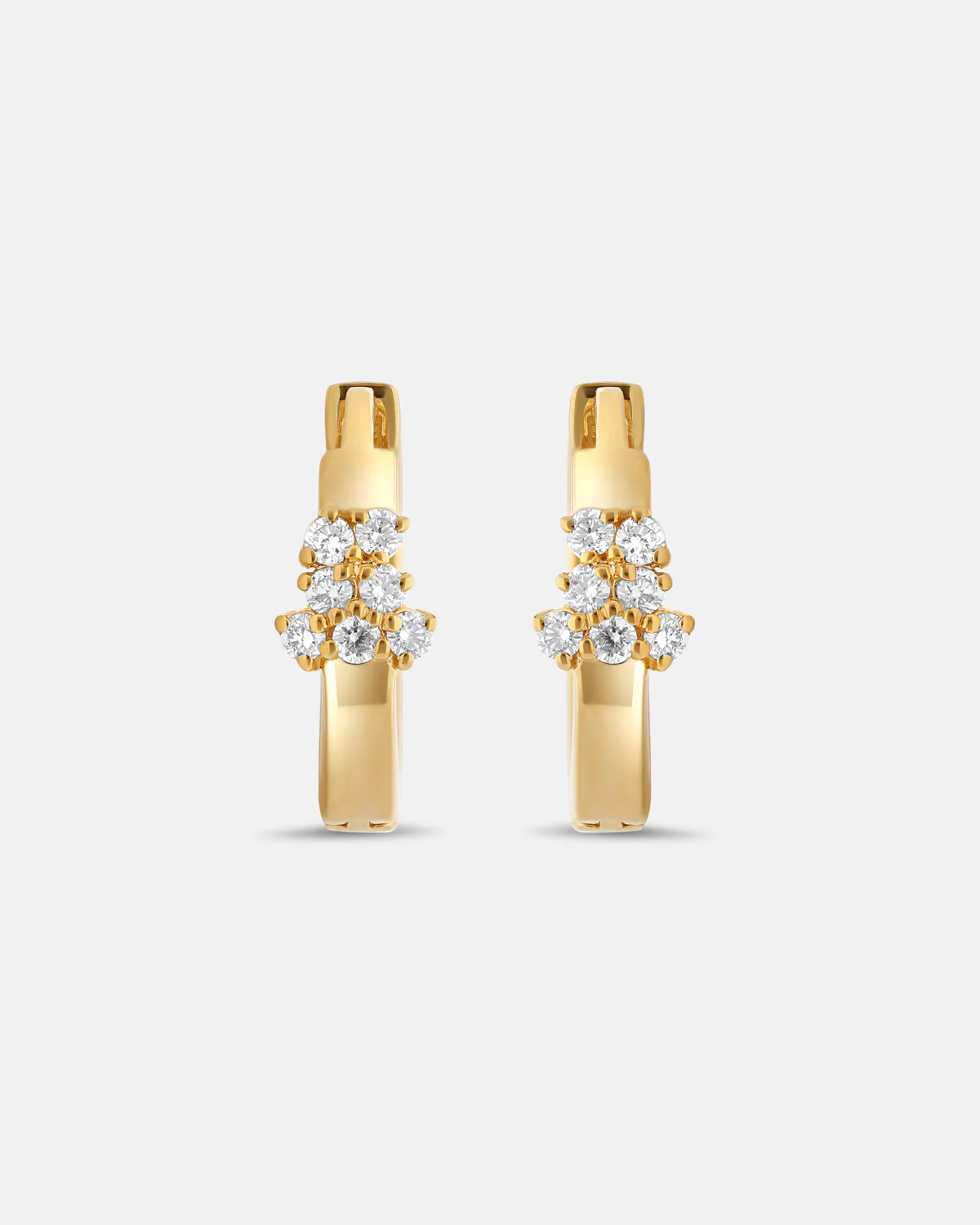 Their compact silhouette brings a sense of ease and intimacy, tracing the ear with gentle curvature and a soft, intentional brilliance. The diamond setting highlights the purity of the form, allowing the interplay of metal and light to take center stage.