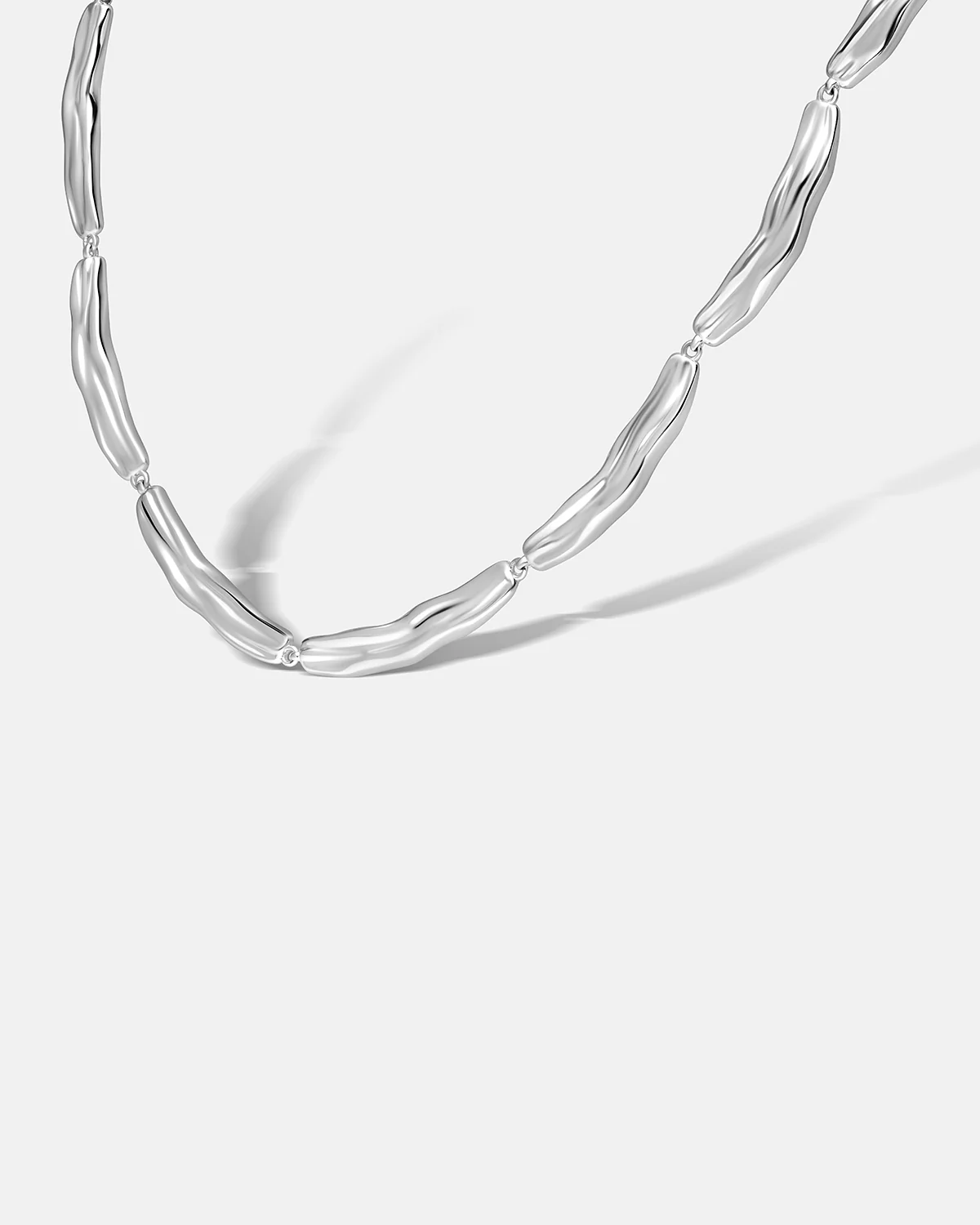 The Aurora Collar Necklace reimagines the classic collar through the lens of movement and texture. Each fluid link reflects the rhythm of light on water, creating a luminous harmony between form and motion.