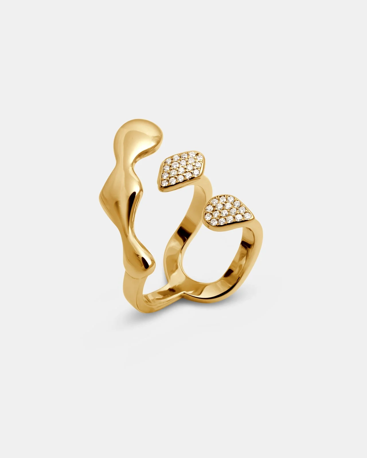 Flux ring in 18k solid gold, pavé-set with diamonds, sculpted with fluid, organic lines inspired by movement and abstract forms in nature. A signature Mara Paris design, its surface combines polished gold and delicate pavé, creating a subtle play of light that follows the hand with precision. Sculptural yet luminous, the ring carries a refined intensity, expressive without excess, radiant without display. Designed to be worn over time, Flux reflects a considered vision of fine jewelry, where craftsmanship and intention take precedence over ornament. Non-adjustable to preserve its sculptural form. Please select your correct size.