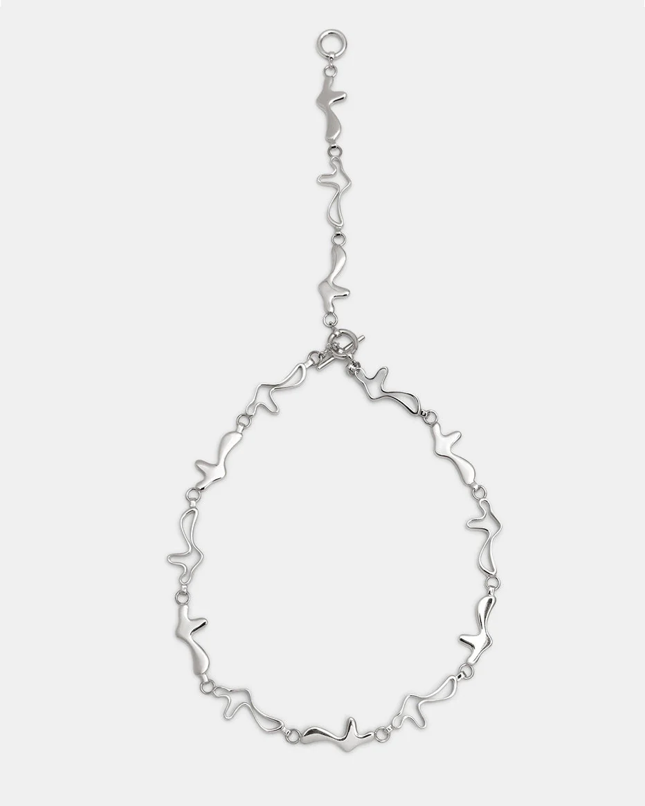 Graceful curves and flowing lines intertwine to create a fluid and striking necklace. Inspired by Alvar Aalto's mastery of liquid forms, this necklace seamlessly blends elements of nature with contemporary aesthetics, resulting in a unique display of organic elegance. A combination of hollow and filled shapes, it effortlessly harmonizes negative and positive space reflecting the tranquility and serenity of the natural world. When adorned, the necklace's gentle undulations mirror the body's natural curves, creating a symbiotic relationship between the wearer and the jewelry. Features a toggle clasp closure.
