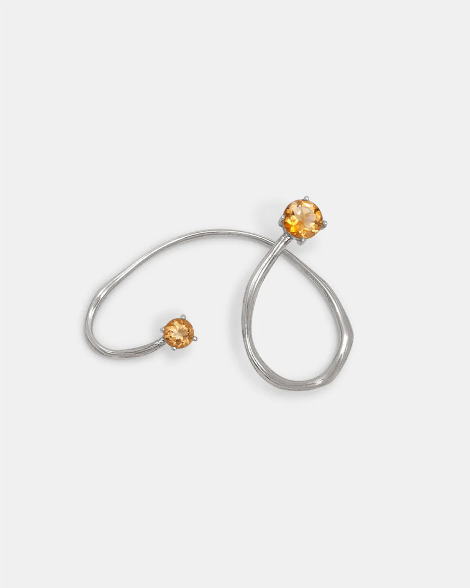 Taking inspiration from the natural world, the Oksa ear cuff effortlessly merges graceful curves and flowing lines, forming a harmonious composition that delicately embraces the contours of the ear. In contrast, two orange-hued citrine stones chosen for their vibrant color and light-catching properties, add a touch of brilliance to the ear cuff, establishing a stunning visual relief and an invitation to explore the unique mysteries of form and beauty. Expertly handcrafted in sterling silver, The Oksa Earcuff can be worn on either side or both sides of the ear.