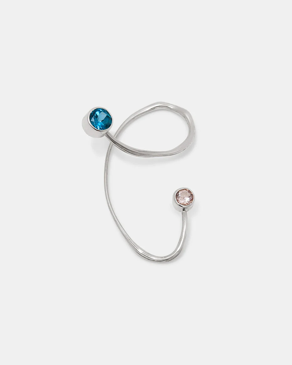 The Oksa Ear Cuff from the “Form Is A Mystery” collection combines curled forms with precious gemstones. Inspired by organic shapes, it showcases a deep blue London topaz and a delicate morganite, chosen for their ethereal qualities. The sculptural composition blends graceful curves and flowing lines that embrace the ear delicately. With its seamless blend of artistry and sophistication, this ear cuff invites you to embrace the enchanting mysteries of form and beauty.
