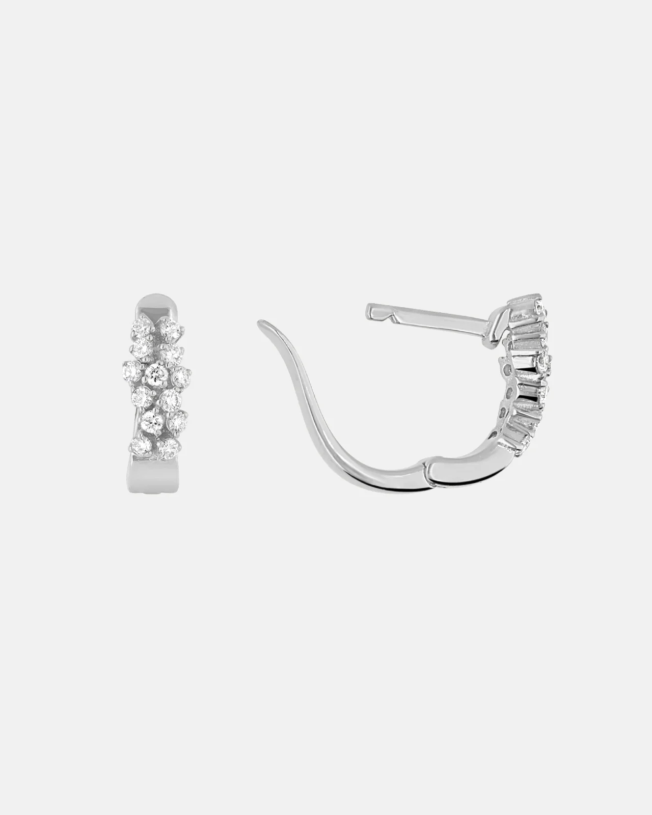 The Quiet Intensity Huggie reimagines classic elegance with a sculptural cluster of diamonds that gently hugs the earlobe. Its compact form is designed to sit close, creating a quiet sparkle that reveals itself with movement and light.